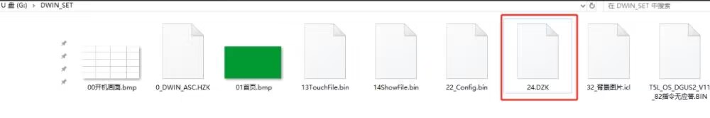 (2)把bin文件放到迪文屏烧录的文件里, 命名方式采用数字16-31的数字开头,然后就是把.bin改成.DZK,采用此方法的目的,就是把需要更新的单片机bin程序伪装成字库文件,诱骗迪文屏认为此文件就是字库文件,下载迪文屏程序的时候,迪文屏会误认为此文件就是字库文件,就会一起存储到迪文屏的flash里面。