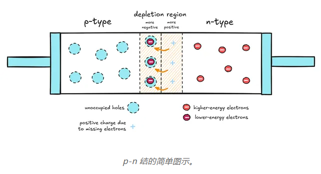 当 n 型材料与 p 型半导体接触时,来自 n 侧的高能电子会随机扩散到 p 侧,然后迅速落入大量的低能空穴中。这会在结处产生一个内部电场,达到热力学平衡。n 侧带正电荷,p 侧带负电荷: