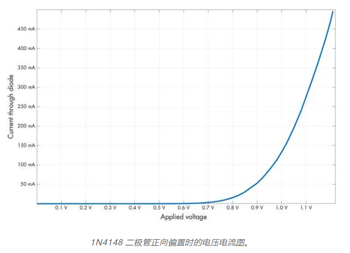 传统的二极管就是一个 p-n 结。该元件可以被认为是一个基本的电压控制器件:当电压低于某个阈值时,它表现出非常高的电阻:通常超过 100 kΩ,因此几乎没有电流可以通过。当超过该阈值时,二极管开始允许更可观的电流通过。V-I 曲线最初是指数型的,但很快,材料的固有电阻开始占主导地位。从那时起,电流与“多余的”施加电压大致呈线性关系: