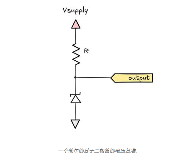 这一观察结果使得二极管可用作电压基准。我们使用一个未稳压的电源,例如电池,在最简单的变体中,使用一个电阻来大致限制流过二极管的电流。根据你想要的电压,你可以使用一个或多个正向偏置的二极管、一个反向偏置的齐纳二极管,或它们的某种组合。
