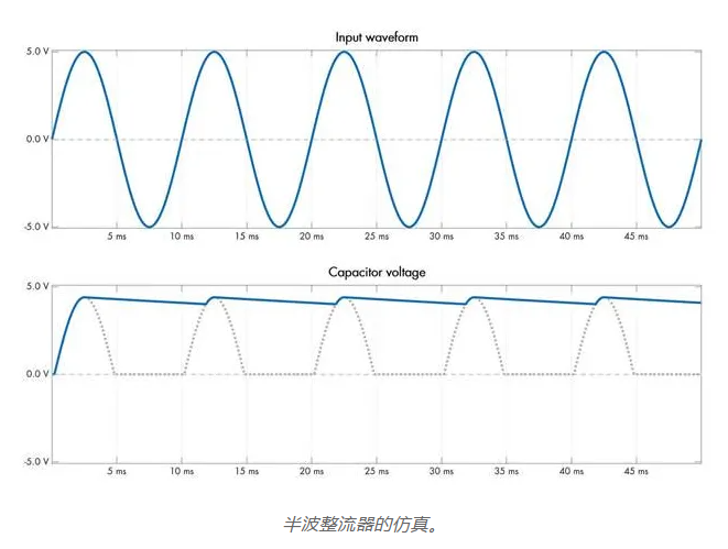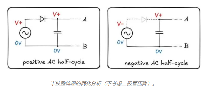 这个电路称为半波整流器。如果我们以标记为 B 的底部输出支路作为所有电路电压的参考点,然后分别评估输入交流波形的正半周期和负半周期,分析是最简单的: