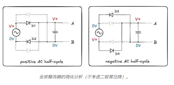 在正半周期,二极管 D1 和 D2 最初是正向偏置的;这允许电容器充电到交流峰值电压(减去两个二极管的压降总和)。在负半周期,二极管 D3 和 D4 变为正向偏置,这将输出 B 连接到上部电源端子。同时,当前处于更高电压的底部电源端子连接到 A 点。这允许电容器继续以与之前相同的极性充电。