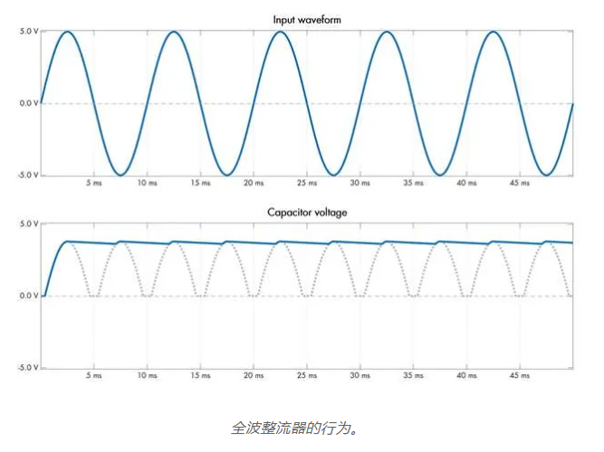 半波整流器的缺点是电容器仅由正弦波的正半周期充电;如果目标是最大化传递给负载的功率,这是浪费的。这个缺陷可以通过构建一个全波整流器来解决,如下所示: