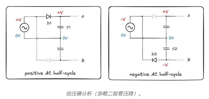 倍压器有多种形式,但一种特别简洁的设计如下所示。该电路输出的直流电压等于以零为中心的输入波形峰值幅度的两倍,减去通常的二极管压降。这与前面讨论的整流器电路形成对比,后者仅产生接近峰值幅度的直流电压:
