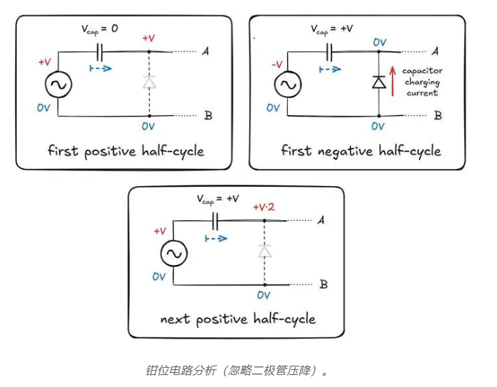 接下来,让我们看看负半周期(右侧)。在这种情况下,顶部二极管始终是反向偏置的,因此它不导电;C1 保持电荷。同时,下方的二极管 D2 可以导通,它为 C2 充电,使得输出端子 B 相对于中点最终处于负电压。实际上,我们将输入波形的正峰值电压存储在 C1 中,将负最大值存储在 C2 中。B 和 A 之间的总电压是 V(peak) *2(再次强调,减去预期的二极管压降)。