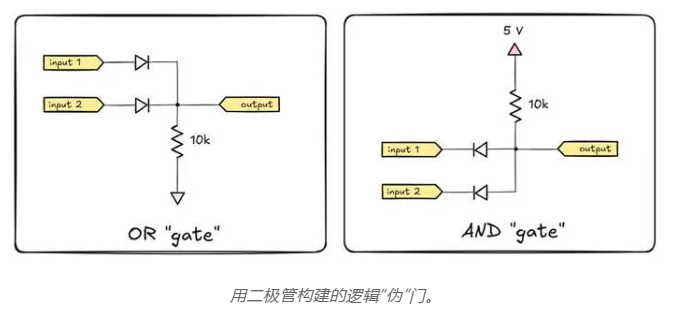 我在插图中给“门”加上所谓的引号,是因为这些电路不容易组合以实现更复杂的数字逻辑;每个门都需要电流流过输入端子,但它不一定能在其输出引脚上传递这样的电流。一个特别麻烦的情况如下所示: