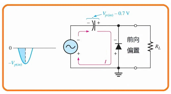 由于这个电流电容被充电到输入波形的峰值V m 。电容的充电极性与二极管两端的信号极性相反。在达到极值点 -V m后,电容器保持存储的电荷,直到该点二极管处于正向偏置状态。