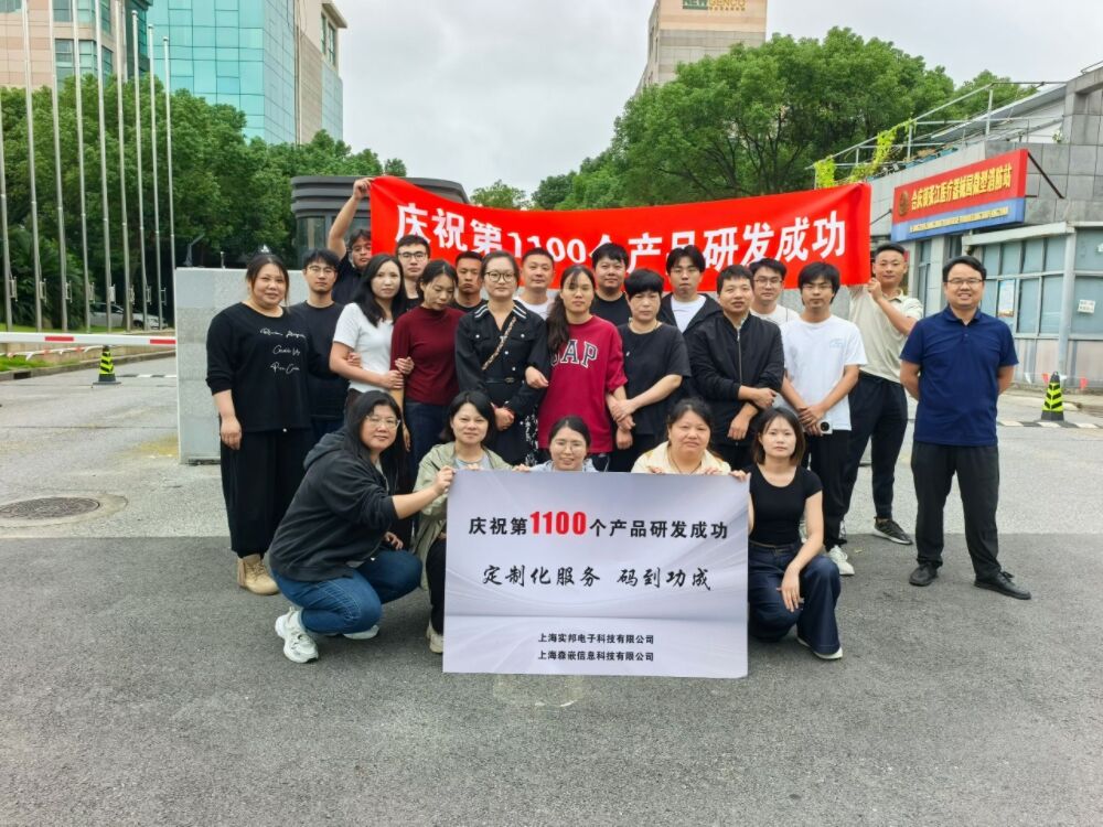 2025年10月14日,上海实邦电子科技有限公司全体员工共同庆祝公司第1100款产品的研发成功。这第 1100 款产品的研发成功,标志着创新征程再迈关键一步。自首款产品推出以来,研发团队以高效创新节奏,构建起多场景产品矩阵。