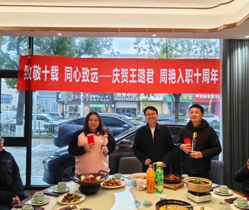 午餐期间,领导放下平日的严谨,起身对王璐君和周艳两位同事逐一给予肯定与表扬。他首先肯定了王璐君作为工程师的专业素养与责任担当,称赞其十年来始终严谨细致、履职尽责,面对繁杂的技术工作和各类难题,始终坚守岗位、务实笃行,高效完成各项工作任务,用专业能力筑牢岗位根基;随后,领导也表扬了周艳作为生产部组长的敬业精神与奉献意识,肯定其十年来初心不改、积极进取,在做好生产统筹工作的同时,主动帮扶同事、勇于创新方法,为团队发展提供了有力支撑。领导的话语恳切实在、情真意切,让王璐君和周艳深受触动,也让在场全体同事感受到了团队的温暖与凝聚力。