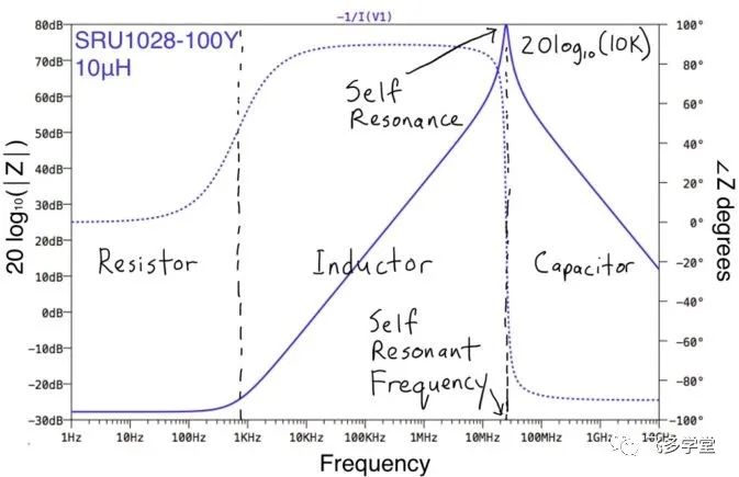 这些额外的元件使得电感具有上图所示的阻抗特性。实线曲线是阻抗的分贝幅值,虚线曲线是阻抗的相位角(phase angle)。在1kHz以下,电感表现为一个小电阻RDC。在1kHz以上,它表现为一个电感,直到接近自谐振频率(SRF)。在SRF附近的一小段频率范围内,电感表现为一个大阻值电阻,其值为RQ。在SRF以上,电感表现为一个电容CSRF。