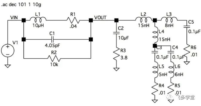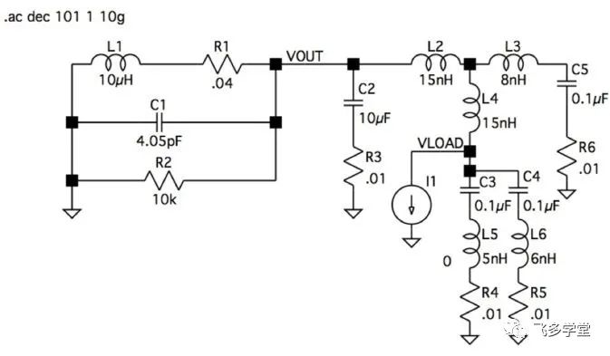 旁路电容还可以与电源分配网络中的电感共振。在电源输入滤波器处阻尼共振并不能保证所有由负载电流引起的共振也会被阻尼,但通常会有所帮助。为了演示潜在问题,这里是未阻尼(R3 = 0.01欧姆)版本的滤波器,其中一个负载点有一个交流电流源。