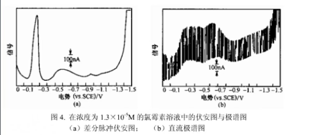总之,DPV由于降低了背景电流而具有更高的检测灵敏度和更低的检出限,使其能够应用于浓度低至约10mol/L(1ug/L)的场合。图4是差分脉冲伏安法的检测能力与直流极谱法的对比。