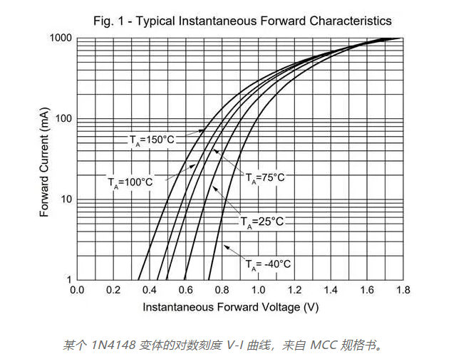 纠结于真实二极管的精确数学模型没有太大意义,但我关于 V-I 曲线并非真正指数型的断言可能与你在别处听到的相悖。为了支持这一点,我们可以在对数尺度上观察其行为。在这个视图中,指数增长应该呈现为一条直线;然而,二极管的曲线却明显弯曲: