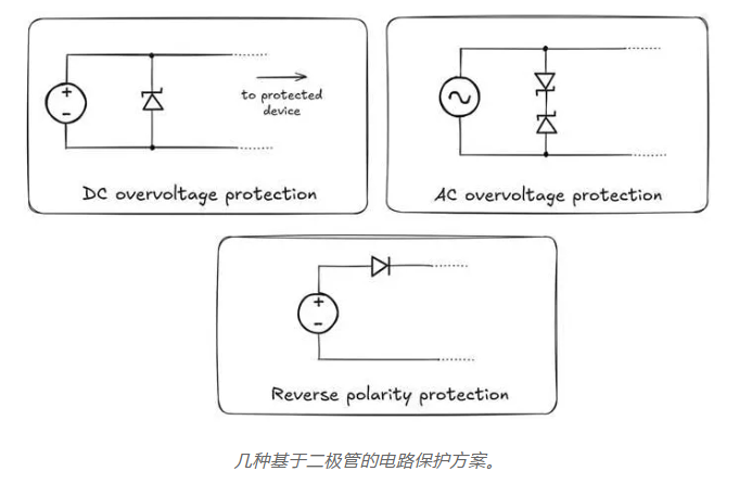 最下方的图显示了另一种保护技术。一个具有高反向击穿电压的普通正向偏置二极管与电源串联;这种布置可以防止在电源极性意外接反(例如电池装反)时损坏敏感元件。其代价是 p-n 结上不可避免的电压降,以及如果电流很高时的阻性发热,因此通常首选基于晶体管的解决方案,尤其是在低压电路中。