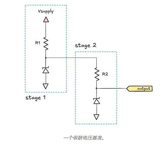 当然,第一个二极管的齐纳电压应该高于第二个。此外,为了使级联布局正常工作,我们需要确保第二级吸收的电流远低于流经预期电阻-二极管路径的电流。确保这一特性的一种方法是选择 R1≪ R2。另一种解决方案是用一个晶体管电路来隔离这两个阶段,该电路镜像第一级的输出电压供第二级使用;这种电压跟随器电路在这里讨论。