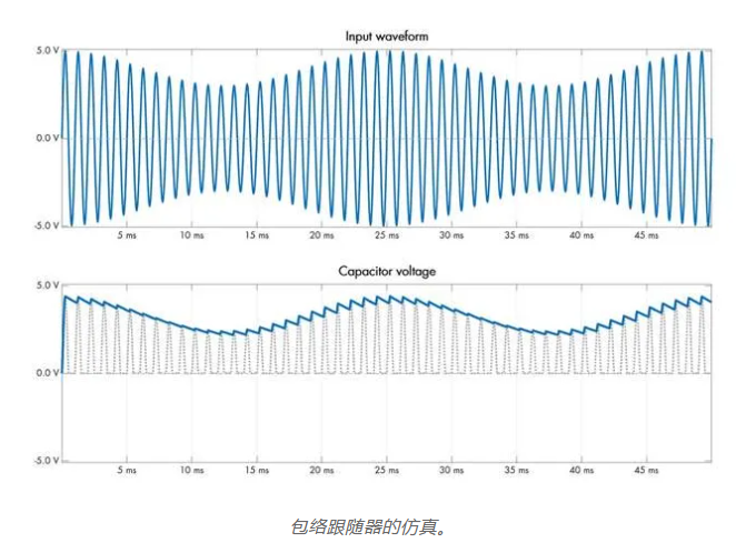 如果负载电阻成为电路的永久部分,并且其选择使得电容器放电足够快,以跟上传输波的幅度调制,我们就得到了一个称为包络跟随器的电路。该电路是在 AM 广播电路中从载波信号中提取近似调制波形的简单方法: