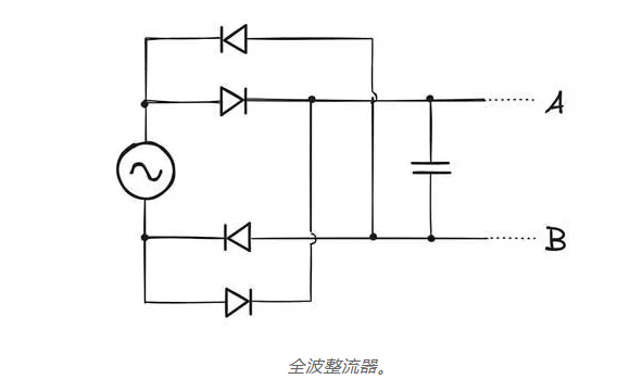 半波整流器的缺点是电容器仅由正弦波的正半周期充电;如果目标是最大化传递给负载的功率,这是浪费的。这个缺陷可以通过构建一个全波整流器来解决,如下所示: