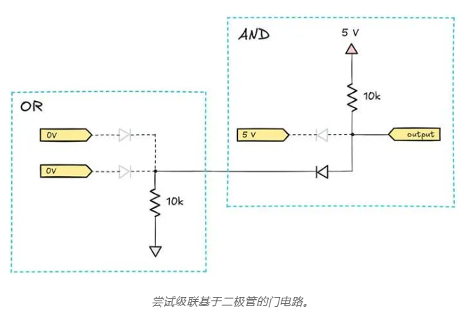 我在插图中给“门”加上所谓的引号,是因为这些电路不容易组合以实现更复杂的数字逻辑;每个门都需要电流流过输入端子,但它不一定能在其输出引脚上传递这样的电流。一个特别麻烦的情况如下所示: