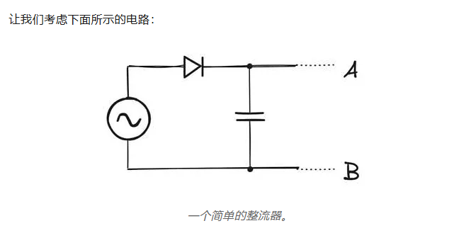 这个电路称为半波整流器。如果我们以标记为 B 的底部输出支路作为所有电路电压的参考点,然后分别评估输入交流波形的正半周期和负半周期,分析是最简单的: