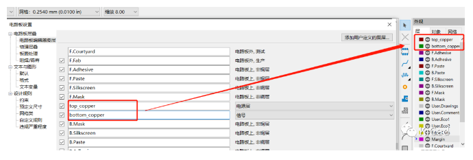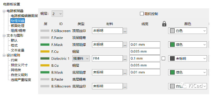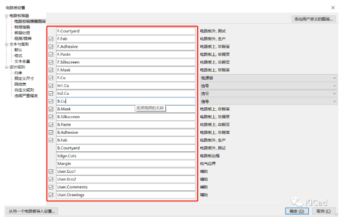 可以在“电路板设置”中查看所有的层及其分类。默认情况下,F开头的层为顶层(Front),比如F.Cu表示顶层,F.Silkscreen表示顶层丝印层;B开头的为底层(Back),比如B.Mask表示底层阻焊层。中间信号层默认以In1.Cu的方式命名。